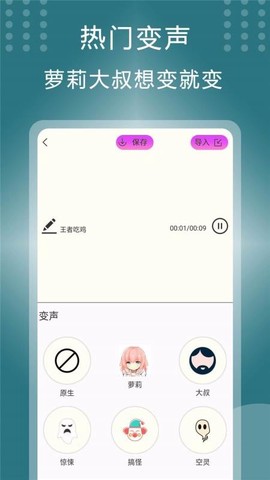 2.搞笑变声:选择你喜欢的角色,一键变声,绝对让你乐享其中,萝莉、大叔、搞怪等多种效果任你选择。